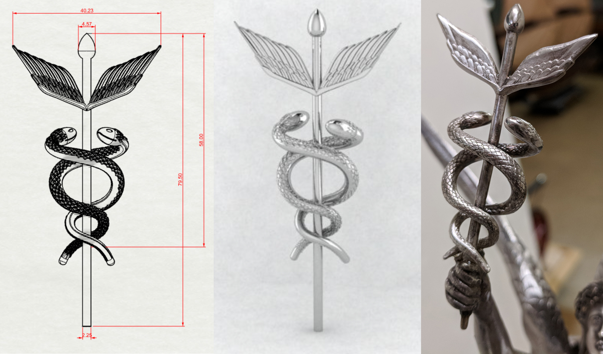 CSI used two different methods to design the missing pieces. The caduceus (missing from Iris’s right hand) and rudder shaft were designed using a CAD program called Rhino. The design was used to produce 3-D printed wax models of the pieces. Those models were then used to cast the replica parts in .925 silver. The work was completed by Liberty Jewelry Manufacturing Company in Timonium, Maryland.