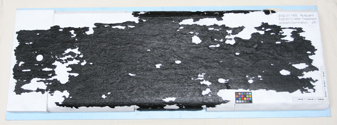 The most delicate part of the treatment was preserving a large iron fragment connected to the edge of the nutguard by just a tiny ribbon of metal. A cloth band on the storage mount secures it to prevent it from moving.